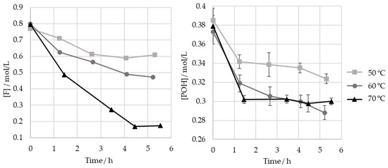 where is the initial concentration of formaldehyde; and are the concentrations of the formaldehyde and phenolic groups type I and II at time , respectively; is the concentration of the phenolic groups type I and II available to react with formaldehyde at the beginning of the reaction [24,44].