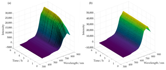 The spectrometer used for the in-line acquisition of the visible spectra of the reaction medium was a Torus Concave Grating Spectrometer (Ocean Optics, Ettlingen, Germany) equipped with a Solvias FLEX transflection probe (Solvias, Kaiseraugst, Switzerland). For this purpose, the probe was immersed directly in the reaction mixture and spectra acquisition was commenced when formaldehyde was added. Two spectra were acquired per minute using 32 scans, a resolution of 0.24 nm, and an integration time of 1 ms. The wavelength range was from 342 to 825 nm. The software used for data collection was Ocean View 1.6 (Ocean Insight, Orlando, FL, USA).
