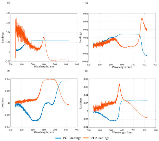 The spectra obtained were mean-centered, and PCA analysis was carried out. Firstly, the loadings of the first and second principal components, PC1 and PC2, were analyzed. The results obtained for SLS are shown in Figure 10a. For HLS, the results are shown in Figure 10b–d for the temperatures of 50, 60, and 70 °C, respectively.