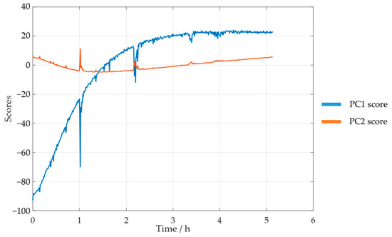 Taking these results into account, a new PCA analysis was carried out while only considering the selected spectral region. The reaction progress was verified through the analysis of the scores. The PC1 and PC2 scores for SLS methylolation are shown in Figure 11.