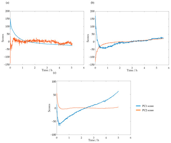 PC1 and PC2 scores for the methylolation of the HLS sample at 50 °C (a), 60 °C (b), and 70 °C (c).