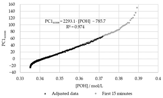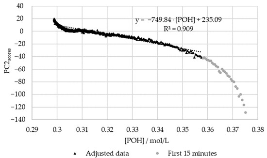 Figure 15 shows that, once again, the regression between the off-line data and the PC1 scores is high (R2 > 0.95). However, for this, the first fifteen minutes were again excluded due to the significant delay in the off-line method. In agreement with the results for SLS, the deviations in the off-line method are especially high at the beginning and end of the reaction. Particularly, in the beginning, the most significant discrepancies are observed within the first 5 min of the reaction ([POH] > 0.37 mol/L). At the end of the reaction, the modeled decay of the phenolic groups appears to stabilize, unlike the in-line data. This may be partially explained through the analysis of Figure 8, where the decay of the phenolic groups appears to follow a different reaction rate at the end of the methylolation. This was not accounted for in the second-order model used to fit the data. Further trials would be needed to confirm this behavior.