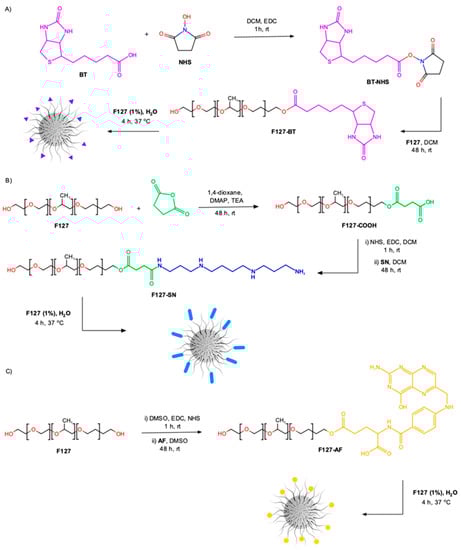 Schematic representation of the reaction and micelle preparation to obtain: (A) F127-BT, (B) F127-SN, and (C) F127-AF.