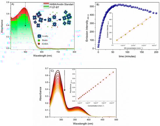 (A) HABA/Avidin assay for the determination of BT bound to the F127. Schematic insert of HABA/Avidin behavior in the presence of biotin. (B) Kinetic profile of fluorescamine with spermine addition. Insert calibration curve obtained to determine the percentage of SN bound to the F127. (C) UV-Vis electronic absorption spectra and curve obtained for the determination of the percentage of AF bound to F127 (30.0 °C, λmax = 290 nm). The black arrow on the side indicates the direction of the fluorescence signal with the titrations.