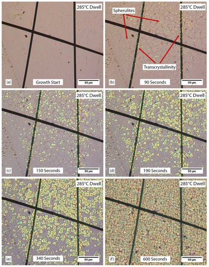 An example of spherulite and transcrystalline growth during a 285 °C isothermal dwell is shown in Figure 4, which is a series of frames from a video taken in situ. Figure 4a,f show before and after crystal growth, respectively. Figure 4b–f shows crystal growth with increasing time: 0 s, 90 s, 150 s, 190 s, 340 s, and 600 s. Transcrystallinity can be seen nucleating in Figure 4b and grows until visible growth stops in Figure 4f. This was determined by analyzing the entire source video for the frames shown in Figure 4. This transcrystalline growth begins spherulite-like similar to one of the fibers shown in Figure 3. After some time, the growth transitions to be more traditional transcrystallinity. The transition from spherulite-like to transcrystallinity indicates an increase of nucleation along the fiber. An alternative method of transcrystallinity formation involves an excess of initial nuclei across the fiber, essentially skipping the spherulite-like phase. As initial nuclei cannot be detected with the resolution of this PLM technique, it is not clear whether spherulites or transcrystallinity nucleated first.