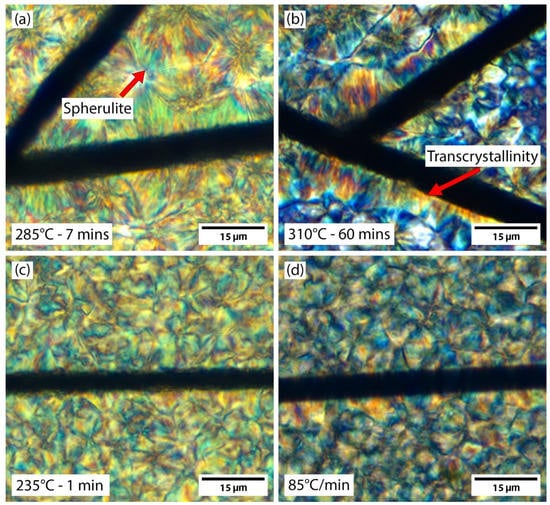 A comparison of the final microstructures in all four cycles is shown in Figure 5. Data for spherulite and transcrystalline growth rates are summarized in Table 1. When measuring size to calculate growth rate, spherulite diameter and double the transcrystallinity length normal to the fiber surface are used. The 285 °C and 310 °C isothermal dwells, shown in Figure 5a,b, produced the largest spherulites and transcrystalline regions. The 235 °C dwell and 85 °C/min cooldown as shown in Figure 5c,d produced small spherulites that did not have clear edges in PLM. This may be due to the limitation of the light microscopy technique. There was slight transcrystalline growth at 235 °C, and more consistent transcrystalline growth after an 85 °C/min cooldown. To fully resolve the smaller transcrystalline regions in Figure 5c,d, carbon fibers were put out of focus, making them look smaller than Figure 5a,b. All samples had a large amount of variation in growth rate data as listed under Table 1.