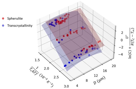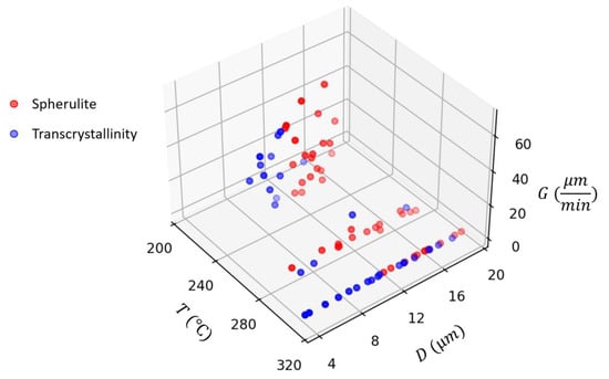 Upon training, GPR showed an accuracy of 98% to predict the validation dataset. The fitted mean response surface for transcrystallinity growth is shown in Figure 7. This figure clearly shows that while spherulite growth follows a linear correlation as predicted by Lauritzen-Hoffman Equation (2), transcrystallinity shows a nonlinear correlation. From these fitted GPR models, energy barriers for secondary nucleation in Lauritzen-Hoffman equation () can be estimated to be 4.7 (105 K2) for spherulites and 5.5 (105 K2) for transcrystallinity. From these estimated values (also confirmed in Figure 7), it can be observed that growth rates are in general faster for spherulites compared to transcrystallinity regions.
