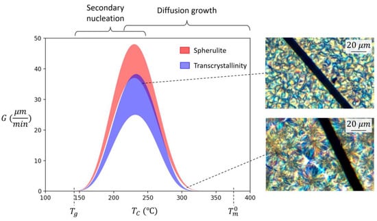Another important observation is the bell-shaped curves in Figure 8. While diffusion growth increases closer to , secondary nucleation increases closer to . The combination of these two mechanisms leads to a maximum growth rate somewhere in between the glass transition and melting temperatures, where thermal energy for diffusion is abundant and the drive for secondary nucleation high. In addition, the small undercooling at temperatures close to the melting temperature reduces the quantity of initial nuclei, leading to large spherulites and transcrystallinity regions as demonstrated by PLM results in Figure 5a,b, and also in Figure 8. At temperatures close to the glass transition temperature, small spherulites and transcrystallinity regions are formed with unclear boundaries as shown in Figure 5c and Figure 8 due to high drive for initial nucleation but relatively low thermal energy for growth.