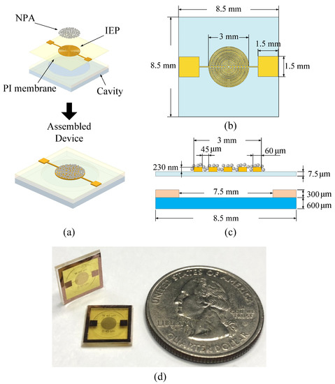 This sub-section described the sensing principle of percolative NPAs and realized the proposed dewetting process of the silver thin film. Figure 1a shows the schematic and the exploded view of the proposed pressure sensor. The device consists of a sealed reference-pressure cavity and a polyimide (PI) membrane patterned with an IEP. In addition, an array of randomly distributed silver NPs deposited on the IEP and the PI membrane serves as the key pressure-sensing element using the percolation phenomenon. Figure 1b,c are the top view and the cross-sectional view of the device, respectively. The dimensions of the device are also indicated in the sub-figure. The thickness of the IEP is 230 nm, and the width of each IEP finger is 60 µm. The gap between IEP fingers is 45 µm.