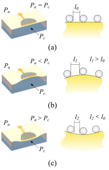 The device’s operational principle is shown in Figure 2, where Pa is the ambient pressure. Pc is the cavity pressure created during the cavity-sealing process and serves as the reference pressure. The figure on the right side is a schematic view illustrating the distance between silver NPs. As Pa is the same as Pc (Figure 2a), the PI membrane is undeformed, and the average distance between NPs is . As Pa is smaller than Pc (Figure 2b), the membrane deforms upward, which induces a tensile strain around the central region of the top surface of the membrane [20]. Consequently, the average distance between adjacent NPs increases (), resulting in the destruction of the percolation pathways, which results in an increase in the NPA sheet resistance [22,30,31,32]. Figure 2c is the schematic illustrating the behavior when Pa is larger than Pc. The mean distance between silver NPs decreases (). Thus, the number of percolative pathways in the whole sensing element increases, which in turn decreases the NPA sheet resistance. Hence, the resistance change in the NPA, which can easily be measured with the IEP patterned on the PI membrane, reflects the pressure difference between Pa and Pc. Based on the model presented in [30], the ratio of the electrical conductivity (resistance) of the thin films can be described by the following equation: