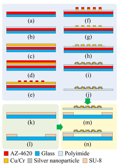 Figure 3 illustrates the micromachining process to fabricate the proposed pressure sensing device. The IEP layer was patterned onto the PI film (Kapton® KJ, DuPont, Taipei, Taiwan) using standard micromachining techniques (Figure 3a–g). First, a layer of an AZ-P4620 photoresist film (10-µm) was spin-coated onto a glass wafer (Figure 3a). The photoresist serves as a sacrificial layer. Then, a PI layer was deposited onto the sacrificial layer (Figure 3b). A 30-nm chromium (Cr) layer, which served as an adhesion layer for copper (Cu) layer deposition, was then deposited by a sputtering process. Subsequently, a 300-nm Cu layer was sputtered onto the Cr layer (Figure 3c). Then, another layer of AZ-P4620 photoresist was spin-coated (Figure 3d). This layer was patterned as the IEP etching mask (Figure 3e). The IEP was formed by a wet etching process (Figure 3f) using a copper etchant (CE-100, Transene Co., Danvers, MA, USA) and a chrome etchant (CR-7, Transene Co., Danvers, MA, USA). Then, the etching mask (AZ-P4620 photoresist) was removed by immersing the substrate in acetone (Figure 3g). Subsequently, a silver thin film of 6 nm in thickness was deposited onto the IEP using a sputter [34] (Figure 3h). The deposition rate was 3.5 Å·s−1. The whole area of the IEP was covered by the deposited silver film. Then, by using the dewetting process, silver NPs were created on top of the substrate (Figure 3i). The dewetting process is in fact an annealing process of the silver thin film at 200 °C for 60 min [35,36], and is performed in the chamber of the sputter without breaking the vacuum. Note that, according to our experimental results, the PI membrane starts to wrinkle as the annealing temperature for dewetting exceeds 230 °C. Once the PI membrane wrinkles, it is considered to be damaged. After the dewetting process, the membrane with the IEP was separated from the glass substrate by dissolving the first AZ-P4620 photoresist film (the sacrificial layer) using acetone, as shown in Figure 3j. Finally, the device was assembled by mounting the fabricated PI membrane onto a glass substrate with a SU-8 cavity (Figure 3m,n) and heating it above the glass transition temperature of SU-8 (SU-8 2050, MicroChem Corporation, Westborough, MA, USA). Note that the SU-8 cavity was formed by patterning a SU-8 layer using a standard lithography process (Figure 3k,l). Figure 1d shows the picture of the fabricated devices.