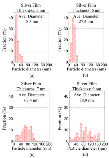 Figure 5 shows the diameter distributions of the particles (i.e., isolated islands or irregular/connected islands) after dewetting. These results indicate that, as the thickness of the silver film (before dewetting) increases, the average diameter of the particles (after dewetting) increases, while the particle diameter’s standard deviation also increases significantly. Obviously, a 6-nm-thick silver film yields an NPA with the highest particle density and the best distributional uniformity. We use an image processing program ImageJ (National Institute of Health, Bethesda, MD, USA) to estimate particle diameters, as well as analyze the diameter distribution of particles from high resolution SEM images.