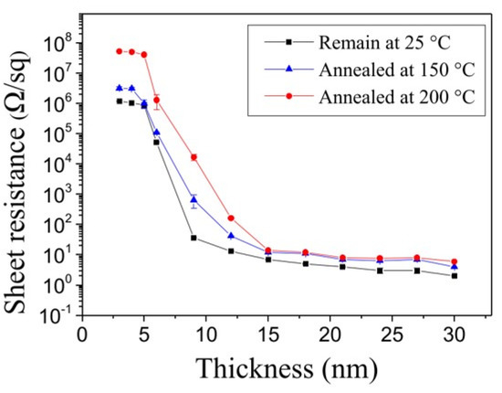 Relationship of the sheet resistance of dewetted silver films vs. the original thicknesses of the silver films prior to dewetting at different annealing temperatures.