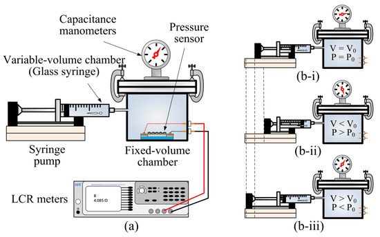 The measurement setup for characterizing the fabricated sensors is shown in Figure 7a. The setup consists of a fixed-volume chamber (2500 cc) and a variable-volume chamber (about 120 cc) that is actually a glass syringe installed on a computer-controlled syringe pump. The variable-volume chamber is connected to a fixed-volume chamber, and the whole system is completely sealed. Therefore, the total internal volume of the chamber system is the sum of the volumes of the fixed-volume chamber and the variable-volume chamber. In addition, four electrical feed-throughs are installed on the fixed-volume chamber for connecting the sensors with external instruments. A capacitance manometer (626C, MKS Instruments, Andover, MA, USA) is also connected to the fixed-volume chamber to measure the internal pressure of the chamber. Figure 7b shows the schematic of how to change the internal pressure of the chamber. As the syringe pump slowly pushes (pulls) the plunger of the syringe, the total volume of the system decreases (increases), and thus the internal pressure of the system increases (decreases). The fabricated sensor is connected electrically to an LCR meter (6440A, Wayne Kerr Electronics Co., Woburn, MA, USA) that is located outside of the fixed-volume chamber through a vacuum-compatible feed-through.