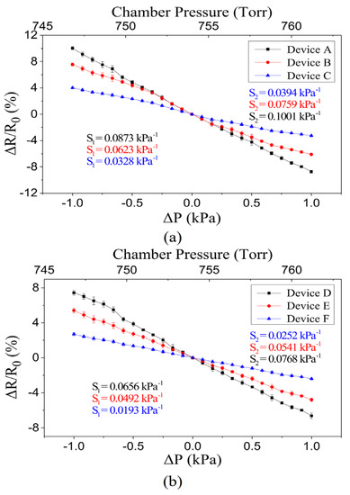 Figure 8a,b show the relationship between the measured resistance change vs. the pressure variation for the fabricated pressure-sensing devices with different design parameters listed in Table 1. More than 10 samples were manufactured for each device configuration (i.e., devices A, B, C, D, E and F). The cavity diameters of the devices in Figure 8a,b are 7.5 mm and 6.0 mm, respectively. In addition, the three curves shown in each figure result from devices with different PI membrane thicknesses. Each data point on these curves is the average result of 10 measurements. The error bars of each data point indicate the measured maximum and minimum values. The figures show that, as the ambient pressure is greater than the cavity reference pressure (i.e., ), a compressive strain is induced on the top surface of the membrane, resulting in a decrease in resistance. Similarly, a negative pressure difference (i.e., ), which induces a tensile strain, causes an increase in resistance. The slopes of these curves correspond to the sensor sensitivities. In addition, each curve consists of two lines with slightly different slopes, S1 and S2. The slope S1 is associated with the condition shown in Figure 2b, and the slope S2 is associated with Figure 2c. These measured results also indicate that the sensor with a thinner membrane exhibits a higher sensitivity because substantially more membrane deformation can be induced at the same applied pressure. In addition, devices with larger cavity diameters (when the size of the IEP is the same) are more sensitive due to the smaller effective stiffness of their membranes [38]. A brief modeling of this behavior can be found in the Supplementary Materials. Among these devices, the maximum sensitivity is about 0.1 kPa−1.