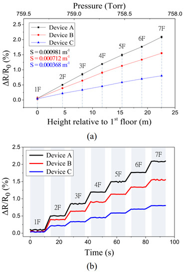 Figure 9 shows the transient responses of device A (shown in Table 1) under cyclic pressure loadings. For each cycle, the NPA’s resistance rapidly changes in line with the applied pressure. A decrease in NPA resistance corresponds to a decrease in the mean distance between NPAs as the applied pressure increases. The return of the NPA’s resistance to its original level corresponds to the release of the applied pressure. One practical application of the fabricated sensors with ultrahigh resolution was demonstrated by using it to measure the altitude of the floors of a building. Figure 10a shows the sensor responses to the relative height of each floor. During the measurement period, the sensors move with an elevator that starts on the 1st floor, makes a stop on each floor, and finally reaches the 7th floor. Each data point is the average value of 10 measurements. The ambient pressure for each floor was also measured using a capacitance manometer (626C, MKS Instruments, Andover, MA, USA). Again, the results indicate that the sensitivity was higher for the device with a thinner membrane. Figure 10b shows the transient responses of the sensors as the elevator moves up and makes a stop on each floor for about 10 s. Each curve was measured during an elevator ride (from the 1st floor to the 7th floor). The transient curves closely follow the motion of the elevator.