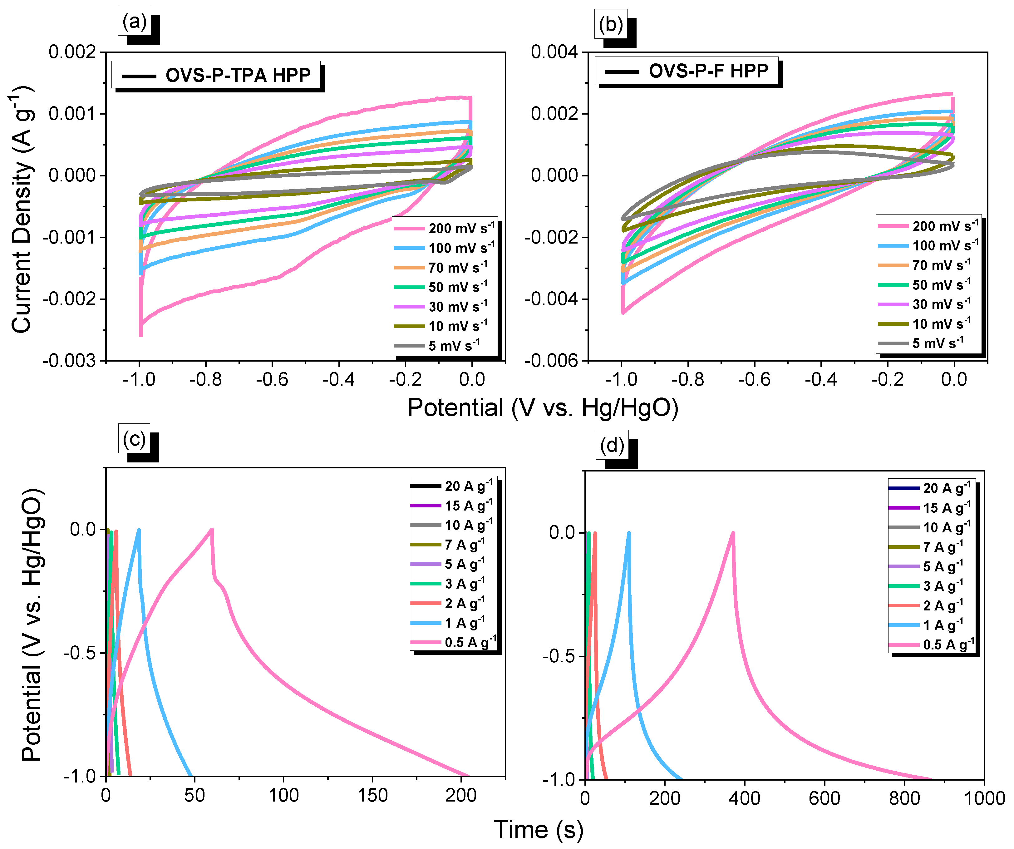 3.2. Electrochemical Analysis of the OVS-P-TPA and OVS-P-F HPPs