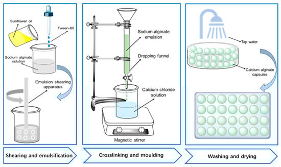 The Ca alginate capsules were synthesized at room temperature, and the specific process is shown in Figure 1. The process is divided into four steps: (1) add SA powder to room temperature water and stir for 5 min to form a 2.25 wt% homogeneous SA solution. (2) Add Tween-80 and rejuvenator to the SA solution and shear at 5000 r/min for 15 min to obtain a homogeneous sodium alginate-oil (SA-O) emulsion. The fixed water–oil ratio and surfactant dosage were 1:10 and 5% (oil mass), respectively. (3) Pour the finished emulsion into a custom funnel and instill it into a CaCl2 solution (3.0 wt%); this is then kept for 12 h to ensure the complete reaction of the alginate chain with Ca2+. (4) Remove the wet capsule, rinse it with water, and leave it in a tray at a moderate temperature for 48 h to obtain a dry capsule.