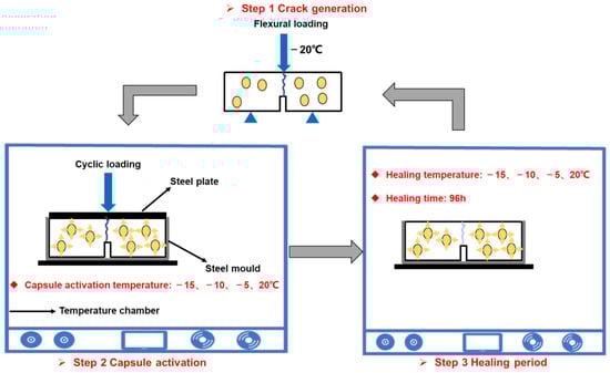 As illustrated in Figure 3, the fracture-cyclic loading-healing-refracture test was divided into four steps: (1) to obtain the initial bending strength, 3PB tests were performed sequentially on the asphalt mixture beams with and without capsules. The trial temperature was set as −20 °C, and the load conduction rate was set as 0.5 mm/min. (2) The cracked beam was placed into a steel mold, and the ballast pressure (0.7 MPa) was uniformly dispersed by placing steel plates on the beam. The loading cycles were set to 0, 16,000, 32,000, 48,000, and 64,000 to simulate actual vehicle tire loading on the capsules within an asphalt road for a period of 1 year, 2 years, and 4 years, respectively []. The test temperatures were set to −15, −10, −5, and 20 °C, respectively. The low-temperature service conditions (−15 °C, −10 °C, and −5 °C) were selected by a combination of average temperature data from the cold regions of China and the temperature limit range of the laboratory test apparatus. A service temperature of 20 °C was chosen to maintain consistency with the healing temperatures mentioned in the existing literature and to serve as an ambient temperature reference group for comparative studies of the healing of asphalt concrete under low-temperature service conditions. External loading was used to cause the capsule to release the encapsulated rejuvenator. (3) After the completion of cyclic loading, the beams in the steel molds were put in thermostats at −15, −10, −5, and 20 °C, respectively, and left to rest for 96 h to recover their strength. (4) At the end of the healing period, the 3PB test (as described in step 1) was conducted on the healed beams again.