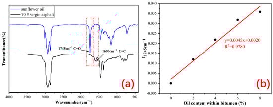 (a) Infrared spectra of virgin asphalt and sunflower oil and (b) the standard curve between I1745cm−1 and the rejuvenator content within the virgin asphalt.