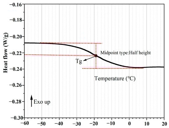 It has been confirmed that the addition of the rejuvenator into the asphalt binder decreases its glass transition temperature and reduces the modulus of asphalt at a low temperature [,,,,]. Hence, the DSC test was performed on different extracted asphalt binders after 64,000 cycles of loading under different test temperatures (−15, −10, −5, and 20 °C) via a TA instrument (TA-DSC2500, New Castle, PA, USA) to determine their glass transition temperatures (Tg). The specific test conditions were as follows: (1) temperature range: −50~160 °C; (2) heating ratio: 10 °C/min; (3) protect atmosphere: N2 (flow rate: 50 mL/min). In this work, according to the midpoint method (as presented in Figure 5), the Tg of asphalt binder was obtained.