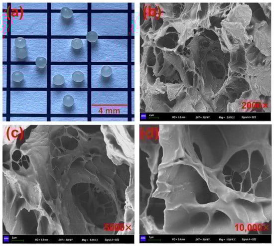 (a) Appearance of calcium alginate capsules and (b–d) the interior structure of the capsules with different magnification times.