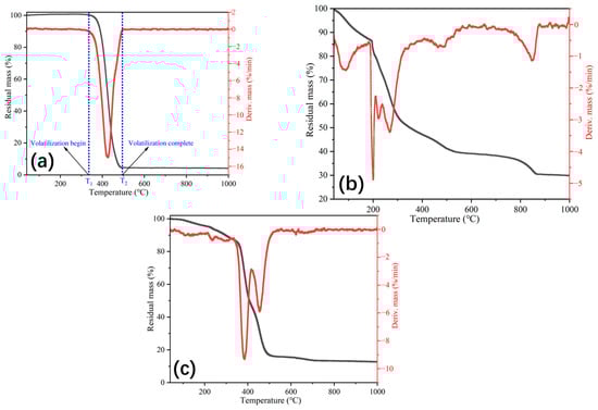 The mass losses of the rejuvenator, the blank Ca alginate capsules (without the healing agent) and the Ca alginate capsules containing the healing agent are presented in Figure 7. As shown in Figure 7a, the healing agent (sunflower oil) starts to volatilize at 345 °C and is completely volatilized at 498 °C. Hence, the remaining mass of the oil capsules and blank capsules in this temperature interval (345~498 °C) can be used to obtain the capsules’ actual healing agent content. Figure 7b shows the retained mass of the blank Ca alginate capsules, and their residual mass at 345 °C and 498 °C were 50.1% and 40.9%, respectively. Figure 7c presents the retained mass of the Ca alginate capsules with the healing agent. From 100 °C to 180 °C, the residual mass of the capsule decreased stably due to the vaporization of the moisture and the destruction of the minor glycosidic bonds that exist in the alginate chains. It is noteworthy that the mass loss of the capsules with the rejuvenator was 4.3% at 200 °C (above the fabrication temperature of asphalt mixtures); the capsules have favorable thermal stability at the asphalt mixture production temperature. Besides, the residual masses of the capsules at 345 °C and 498 °C were 86.2% and 17.1%, respectively. Hence, the relative healing agent content of the capsules can be calculated based on formulas (3) and (4). The relative rejuvenator content of the capsules was 58.5%.