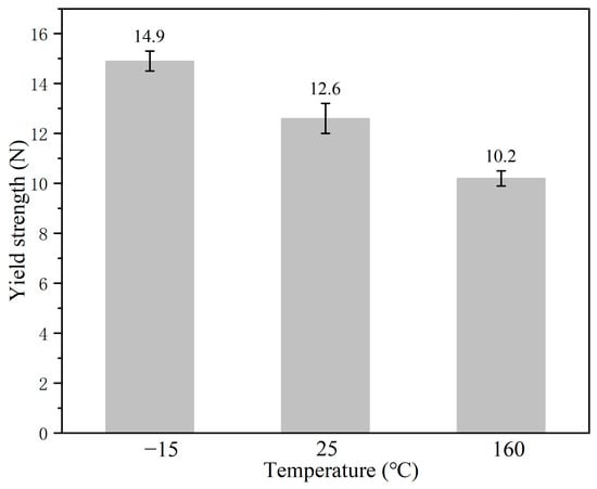 The capsules (mm size) are designed to be added to bituminous mixtures as part of the fine aggregates. Therefore, the Ca alginate capsules must withstand the mechanical action created in the production period of the asphalt concrete. Practice has shown that the mechanical strength of the capsules used for bituminous mixtures must be greater than 10 N [,]. Figure 8 presents the compressive strength of the capsules after specific temperature treatment. The mechanical strength of capsules after different treatments (0, 25, and 160 °C) were 14.9 N, 12.6 N, and 10.2 N, respectively. Lowering the temperature reduces the ability of the calcium alginate molecule chains to move, thus reducing the deformability of the calcium alginate capsules; hence, the capsule has higher strength at lower temperatures. The calcium alginate capsules softened with the increase in temperature, decreasing the compressive strength slightly []. The strength of the capsules under 160 °C was still above 10 N, which implied that the capsule could survive the production of asphalt concrete.