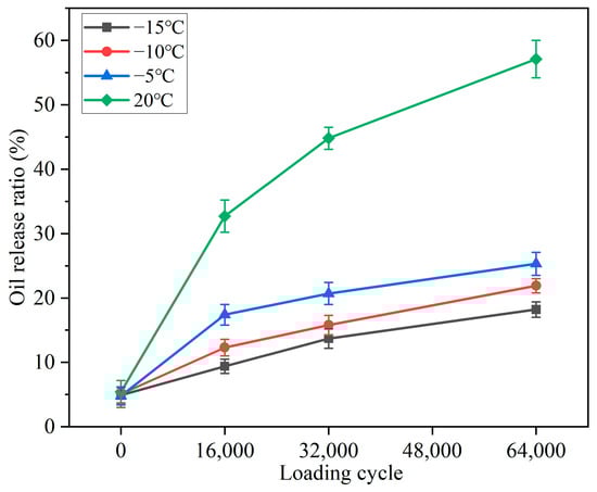 - The oil release ratio of the capsules in the asphalt mixture beams increased with the loading cycles. Nevertheless, after loading with specific cycles, the capsules under low-temperature conditions (−15, −10, and −5 °C) had a lower oil release ratio than the capsules at 20 °C;