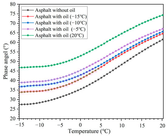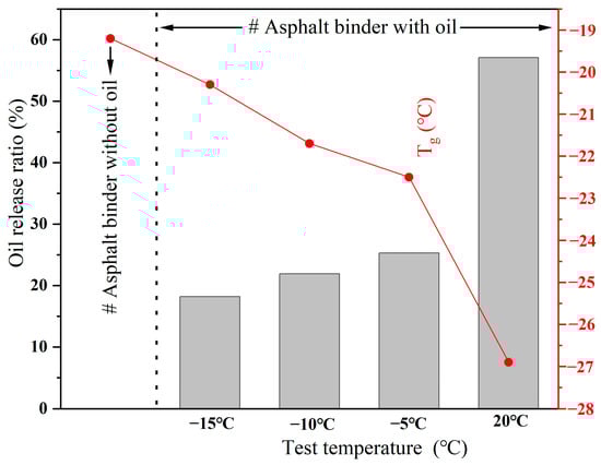 The Tg of the asphalt binders from the mixture beams after loading with 64,000 cycles at different service conditions are presented in Figure 12. The Tg of the asphalt binders with oil was apparently reduced when compared with the asphalt binder without oil. This implied that the release of oil from the capsules could improve the possibility of molecular motions and, thus, decrease the Tg of the asphalt. Besides, the healing agent release ratio increased with the rise in the simulated service temperature, and thus, the Tg of the asphalt decreased due to the rejuvenation effect of the healing agent, which is consistent with other literature [,]. Hence, when compared with a mild temperature (20 °C), the regeneration effect of the healing agent on the asphalt binder under low temperatures (−15, −10, and −5 °C) is less pronounced.