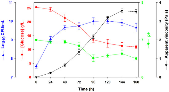 Time course of apparent viscosity (Pa s), colony-forming units (Log10 CFU/mL), glucose concentration (g/L) and pH in assays performed with Rhizobium viscosum CECT908 grown in synthetic medium in flasks at 28 °C and 180 rpm. The results represent the average of triplicate experiments ± standard deviation.