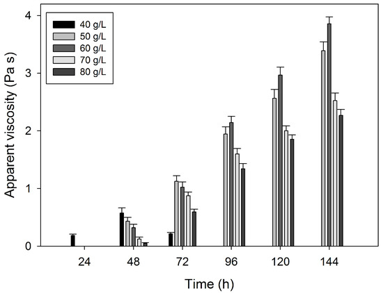Different culture media were prepared containing different concentrations of molasses (40–80 g/L). The cultures were performed as described for the synthetic medium, and EPS production was determined by measuring the apparent viscosity of the culture medium at different time intervals (Figure 2).