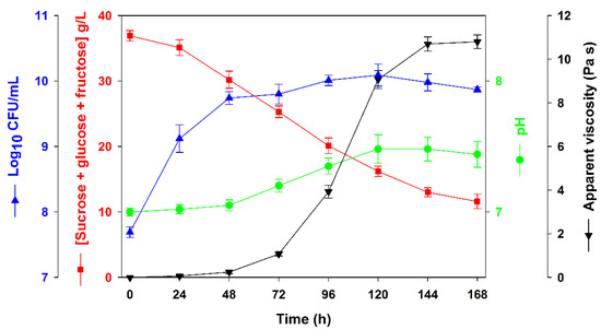 Finally, a simplified low-cost culture medium (CSLM), containing CSL (10 mL/L) and sugarcane molasses (60 g/L) as sole ingredients, was evaluated. In this case, the apparent viscosity values obtained after 144 h of growth were similar to those achieved with the same culture medium supplemented with K2HPO4 and MgSO4 (10,697 ± 326 mPa s (Figure 3)), and the amount of EPS produced was 6.1 ± 0.2 g/L. Despite the higher EPS production achieved, the bacterial growth profile and CFU/mL obtained using this medium were similar to those observed in the synthetic medium (Figure 1 and Figure 3). Regarding the pH, it exhibited an opposite tendency when compared with the synthetic medium, with a slight increase along the bacterial growth. After 144 h, 13.0 ± 0.7 g/L of residual sucrose remained in the culture medium, whereas the concentration of glucose and fructose was almost zero (total sugars consumption rate 64.7%). As can be seen in Table 1, EPS yields were almost the same in the synthetic and the low-cost (CSLM) medium.