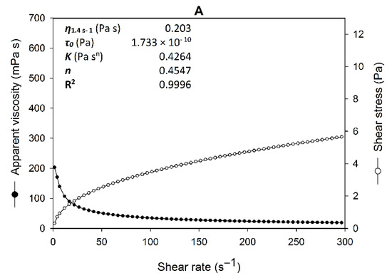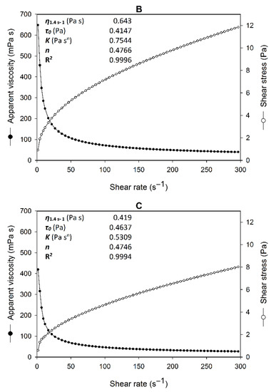 where τ represents the shear stress (Pa), τ0 is the yield stress (Pa), is the shear rate (s−1), K is the flow consistency index (Pa sn) and n is flow behavior index (dimensionless).