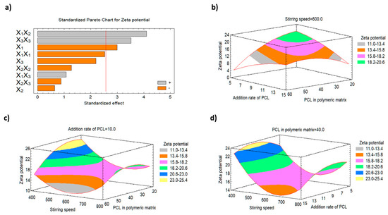 Pareto chart and the three-dimensional response surface plots representing the effect of changing the variables levels on the zeta potential (Y2). (a) Standardized Pareto chart for zeta potential. (b) The three-dimensional response surface plot of the effect of stirring speed on zeta potential (Y2). (c) The three-dimensional response surface plot of the effect of addition rate of PCL on zeta potential (Y2). (d) The three-dimensional response surface plot of the effect of PCL in polymeric matrix on zeta potential (Y2).