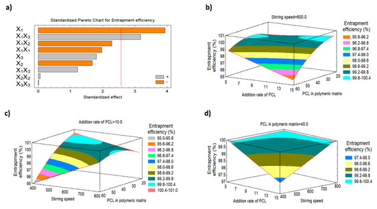 Pareto chart and the three-dimensional response surface plots representing the effect of changing the variables levels on the entrapment efficiency (Y3). (a) Standardized Pareto chart for entrapment efficiency. (b) The three-dimensional response surface plot of the effect of stirring speed on entrapment efficiency (Y3). (c) The three-dimensional response surface plot of the effect of addition rate of PCL on entrapment efficiency (Y3). (d) The three-dimensional response surface plot of the effect of PCL in polymeric matrix on entrapment efficiency (Y3).
