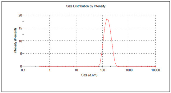An optimized nanoparticle formulation was proposed, prepared and characterized to confirm the practicability of the optimization technique. Combining X1, X2 and X3 at 20%, 6.27 mL/min and 400 rpm, respectively, resulted in maximizing the desirability function of the factors over the design space. This formulation showed a size of 145.5 nm as depicted in Figure 4. No marked residuals were obtained when the observed and predicted response values were compared which indicates the effectiveness of the BBD design for optimization of the prepared nanoparticle. Table 4 displays the results of the observed and expected values. Moreover, the prepared optimized formulation demonstrated a drug loading of 8.9%.