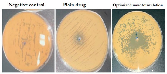 An agar diffusion assay was used to study the in vitro antifungal behavior of the prepared formulations using representative standard strains of fungus. Antifungal activities of the tested formulations against Candida albicans ATCC 76615 showed varying results (Figure 6). No inhibition zone was noticed with a drug-free nanoformulation (negative control). A medium inhibition zone of 15 mm was observed with the plain drug. A marked inhibition zone of about 28 mm was observed with the optimized nanoformulation. The rationale for this finding is the improvement in drug diffusion from the drug-loaded PCL nanoparticles which enhanced the drug antifungal activity as previously mentioned for FLZ-loaded alginate/chitosan-based polymeric nanoparticles against Candida albicans [43].