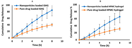 The studied ophthalmic preparations demonstrate a prolonged drug release pattern that lasted for eight hours (Figure 7). Loading the pure drug or the optimized nanoparticles into ISHG and HPMC hydrogel formulations extended the drug release due to the three-dimensional polymeric network which allows drug release only by diffusion from these formulations [46]. It was previously mentioned that hydrogel delivery systems act as a reservoir or a matrix device that control the drug release. In the former (reservoir system), the solid drug particles are present in the core and the system ensures a constant rate of drug release, while in the later (matrix system), the drug is uniformly distributed in the hydrogel matrix as solid particles [47]. A superior drug release profile was observed from the prepared polymeric nanoparticles when compared to the pure drug-loaded formulation, as depicted in Figure 7. A possible explanation for this behaviour is the existence of the drug, in the prepared polymeric nanoparticles, in the colloidal range which facilitates diffusion from the hydrogel reservoir or matrix. On the contrary, the pure drug particles exist in the coarse range which hinder their diffusion. A high cumulative percent of FLZ release (at 8 h) was observed from the nanoparticle-loaded ISHG (84.89 ± 17.5%) than from the corresponding pure drug-loaded ISHG (40.28 ± 4.2%). On the other hand, the prepared HPMC hydrogel demonstrated a cumulative percent of drug release of 65.65 ± 13.5% and 31.5 ± 3.2% from the formulations loaded with nanoparticles and pure drug, respectively. It is noteworthy to mention that the prepared ophthalmic formulations (ISHG and HPMC hydrogel) are expected to be applied right before bed since both might make the patient’s vision sightly blurry due to their viscous nature. Accordingly, eight hours of drug release was studied which is equivalent to the average sleep time for a young adult (7–9 h) [48].