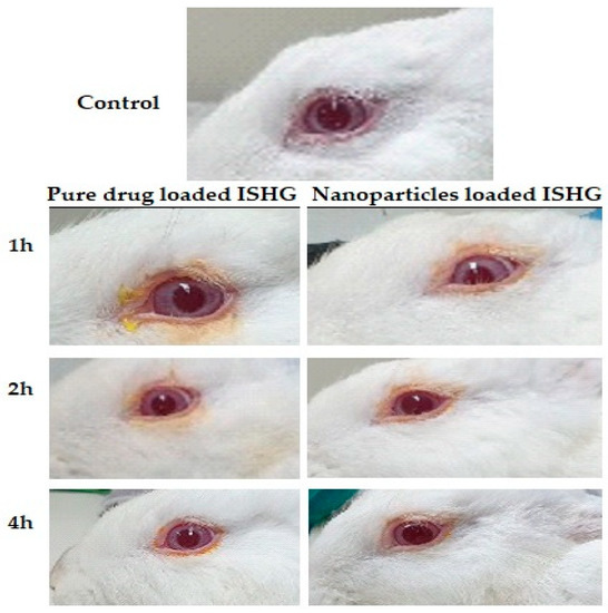 Our research group has previously developed a carbopol-based ophthalmic formulation containing ketoconazole trans-ethosomal vesicles to treat fungal eye infections. The developed formulation was able to treat deep fungal eye infections without causing irritation to the cornea [23]. In this study, the ocular irritation and transport across the eye tissue of the developed formulations were also studied to investigate their safety and efficacy. New Zealand white rabbits were used to investigate the ocular irritation. The results revealed that the prepared poloxamer 407-based ISHG formulations were non-irritants and could be tolerated by the eye. There were no macroscopic signs of iris redness, edema, aberrant secretions, congestion, corneal opacity, bleeding, or significant damage. Comparing the animal eyes to the control, all were normal (Figure 8). As a result, the developed thermosensitive ISHG formulations received a total score of zero in the Draize test’s traditional irritation assessment, making these formulations safe to administer to the eyes. A related discovery was made after the use of ophthalmic in situ gel formulations loaded with pure FLZ, FLZ-hydroxypropyl-beta-cyclodextrin complex-loaded noisome vesicles and Eudragit-based nanoparticles in the treatment of eyes infection [59,60]. In the next section, corneal structure and histopathology of the eye tissues will be investigated.