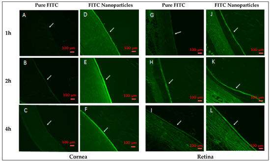It was previously mentioned that size reduction facilitates easy drug uptake by cells, allowing for effective drug delivery [61]. To confirm this concept, the transport of the optimized polymeric nanoparticles from the prepared poloxamer 407-based ISHG across the eye tissue was investigated. Polymeric nanoparticles loaded with FITC were used. Following treatment of the rabbit’s eyes with the nanoparticle formulation loaded with FITC, florescence laser microscopic pictures in the cornea (anterior segment) and retina (posterior segment) were taken and the obtained results are represented in Figure 9. Marked differences in the florescence intensity were observed in the anterior segment among the studied groups over all time points. Easy diffusion of the nanoparticles loaded with FITC resulted in a high florescence intensity after 1, 2 and 4 h. Low florescence intensity was detected in the group treated with the pure FITC formulation. Results for the posterior part of the eye (retina) was consistent with that of the cornea. Poor transport of the pure FITC to the posterior part resulted in a florescence that could hardly be observed. This finding is mainly attributed to distribution of the pure FITC in the ISHG matrix as coarse particles, since this dyne is characterized by its poor aqueous solubility (less than 0.1 mg/mL in water), which hinders its transport across the ocular tissues by the effect of the tears through quick washing of the dye and by eye-blinking action as previously reported [23]. It must be mentioned that the prolonged ocular residence of the ISHG formulation loaded with pure FITC formulation may result in the transport of a limited amount of the dye particles to the posterior part. Löscher et al. previously mentioned that following corneal treatment, the drug may reach the posterior eye segment from the anterior part by absorption into the conjunctiva which is a mucous membrane that begins at the edge of the cornea and lines the inside surface of the eyelids and sclera. The absorption process may be achieved by diffusion through the sclera or cornea or via systemic circulation [1]. Drug-loaded nanoparticles are expected to follow the same pathway.