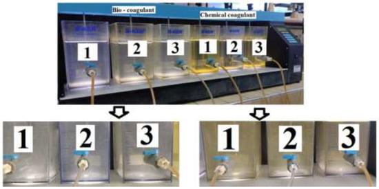 Comparative evaluation of the turbidity- and color-removal capacity in synthetic turbid water using both OFI’s natural coagulant and the traditional chemical coagulant (FeCl3) was performed using a jar apparatus (Phipps & Bird PB-900, Richmond, VA, USA). This equipment supports six vessels of up to 2000 mL capacity and has an automatic controller that allows programming of the time and speed for fast and slow mixes. All experiments were performed at room temperature (18 ± 1 °C). The initial concentration of the coagulants was set at 1.2 g/100 mL of deionized water. The determination of the optimal dose of coagulants was determined at a pH value of 7.85 ± 0.09 (pH synthetic turbid water) by adding six doses in the range of 6 to 36 mg/L. For the determined optimal coagulant dose, the effects of pH in the range of 1 to 13 were studied. The pH of the water was controlled by adding 1.0 M HCl and 1.0 M NaOH. The suspensions were first stirred at 100 rpm for 1 min of rapid mixing to disperse the coagulant and destabilize the colloidal particles, then stirring was performed at 70 rpm for 20 min of slow mixing to bring the destabilized particles into contact and thus form large flocs. The mixtures were allowed to settle for 20 min and the supernatant was used in the analysis of the water-quality parameters. The analyses of the turbidity and color parameters, using a biocoagulant (peel mucilage) and chemical coagulant (ferric chloride), were carried out in triplicate. Figure 1 shows photographs of the main stage involved in the coagulation process using biocoagulant and chemical coagulant.