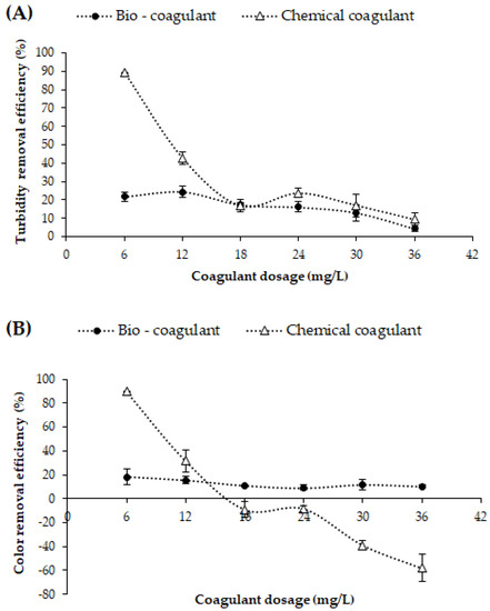The effect of the dosage of coagulant agents (mucilage and FeCl3) in the range of 6 to 36 mg/L at a fixed pH of 7.85 ± 0.09 (synthetic turbid water pH) on the evolution of turbidity and color removal is shown in Figure 2. The results reveal that the maximum removal of turbidity was 24.35 ± 3.13% and of color, 15.44 ± 3.32% (Figure 2a,b), achieved using 12 mg/L of biocoagulant. Moreover, the turbidity- and color-removal efficiency was stable in the dose range. These results agree with those reported by Freitas et al. [16] using okra mucilage in industrial textile wastewater. This result denotes an asymptotic trend of particle removal as the mucilage dose increases, which can be attributed to a process of early coating of the particle surface by the soluble polysaccharides of the mucilage. Such a coating rapidly decreases the number of active adsorption sites and sorption through hydrogen bonding does not occur efficiently; that is, the process of formation of colloidal particles/polysaccharide chain and colloidal particles/polysaccharide chain/complexes is compromised [17,18,19].