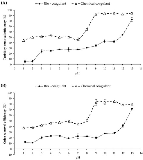 For the sample of synthetic turbid water treated with the inorganic coagulant, turbidity and color removal between 37 and 46% were found at pH values between 1 and 7 (Figure 3a,b). This behavior was mainly attributed to the fact that ferric chloride is a cationic reagent (zeta potential = +9.56 ± 0.63 mV) and the surface of the synthetic turbid water was negatively charged, with electrostatic repulsion predominating, preventing effective floc formation [27]. However, synthetic turbid water at pH values between 8 and 13 had turbidity- and color-removal efficiencies between 52 and 94%, demonstrating the formation of large flocs. This behavior was attributed to the fact that at high pH, the positive charge of the iron coagulant may be neutralizing part of the negative charge on the surface of the particles in the synthetic turbid water, meaning that charge neutralization was the predominant mechanism [28].