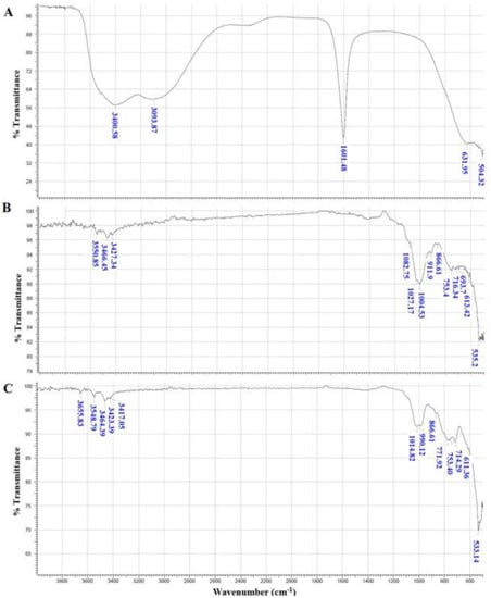 FTIR/ATR spectra in the range of 550 to 3900 cm−1 of the dry samples used in the coagulation/flocculation process. (A) Ferric chloride (FeCl3), (B) Flocs formed using the biocoagulant and (C) Flocs formed using the inorganic coagulant.