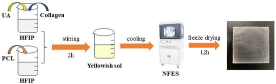 Therefore, in this work, biomaterials (PCL and collagen), active drugs (UA), and other components are directly prepared into microfiber structure biomaterials through near-field electrospinning (NFES) through reasonable design, which have good antibacterial performance, water absorption property, hydrophilicity, and biocompatibility, and are expected to be applied to skin wound treatment and repair, thus making up for the shortcomings caused by the recombination of materials with two different structures prepared by a single technology. Figure 1 is the flow chart of preparing PCL/collagen/UA composite fibers (PCUCF) by NFES.