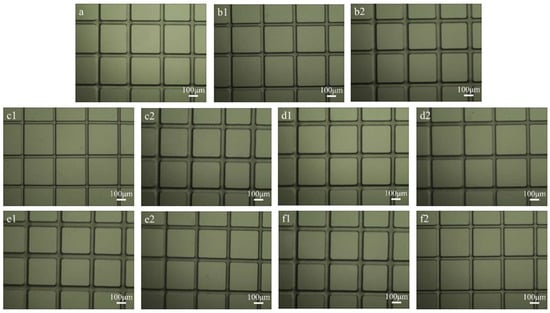 Figure 3 shows the morphology of fibers with different electrospinning process parameters (in Table 1) observed under the microscope. As shown in Figure 3a,b1,b2, when the solution concentration was lower than 18% in the past, there were too many liquid drops on the fiber surface, which made the fiber appear obviously uneven, and the fiber morphology was poor (as shown in Figure 3b1). When the solution concentration is higher than 18%, the solution viscosity is too high, which easily leads to an unstable fiber diameter (as shown in Figure 3b2), and the needle is very easy to block, making the spinning process difficult. As shown in Figure 3a, the fiber diameter obtained from 18 wt% PCL solution is uniform (53.4 ± 1.6 μm). This may provide a preliminary basis for subsequent drug loading, release, and other functions. Therefore, the concentration of PCL was fixed at 18 wt% in this study.
