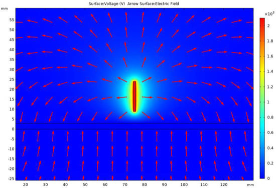 In order to theoretically explore the influence of near-field electrospinning parameters on fiber forming, the optimal voltage parameters obtained in Section 2.2.2 were calculated by using the electric field simulation module of COMSOL to calculate the high-voltage electric field potential formed after the spinning head tip was energized, and the distribution cloud diagram of potential and the distribution diagram of electric field line body arrow were obtained.