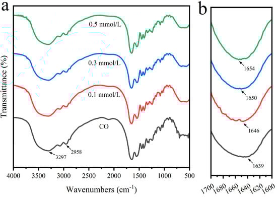 Figure 5a shows the FTIR spectra and corresponding wave number changes of collagen cross-linked by different amounts of genipin. On the whole, the collagen structure after crosslinking has not changed; in short, the basic structure of collagen will not be damaged by genipin crosslinking. In the infrared spectrum of collagen, there is a broad peak at 3297 cm−1, which is attributed to the stretching vibration of the O-H or N-H of collagen amide group, which is the characteristic adsorption of the amide A band. The peak value at 2958 cm−1 is designated as the characteristic amide B band of collagen, which is caused by the asymmetric stretching vibration of the C-H group of collagen. The peak value of 1639 cm−1 is attributed to the C=O stretching vibration of the amide I band. This is similar to the result of Feng et al []. As shown in Figure 5b, the amide I band of collagen crosslinked at different concentrations (0.1–0.5 mmol/L) moves towards high wave numbers. With the increase of genipin concentration, the movement of amide I band in collagen is more obvious, which means that genipin has a higher degree of crosslinking with collagen. Schiff base reaction argues that in the presence of crosslinking agent, the reaction can be indicated by the movement of the amide I band to a high wave number []. Therefore, the crosslinking reaction takes place through the Schiff base reaction between genipin and the amino group in collagen.