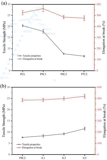 Figure 7a shows the mechanical property test results of composite fibers with different contents of collagen. The results showed that the higher the content of collagen was, the less tightly the PCL molecular chains were bound, and the lower the tensile strength and elongation at break of the fibers were. However, the content of 10% wt protein is an exception, because the addition of protein has bonded the fiber to a certain extent, which has slightly improved the elongation at break. As shown in Figure 7b, the tensile strength of the composite fiber with 20% content of collagen is only 7.6 ± 0.3 MPa. With the increase of genipin concentration, the tensile strength of the composite fiber continues to increase. When the concentration of genipin was 0.5 mmol/L, the tensile strength of the composite fiber reached 10.8 ± 0.9 MPa, and the elongation at break also increased slightly. It can be seen from this that the collagen chain of the composite fiber cross-linked by genipin becomes longer, leading to the tight connection of the spinning fibers, which leads to the enhancement of mechanical properties. This is consistent with the research results of Zhou et al. [].